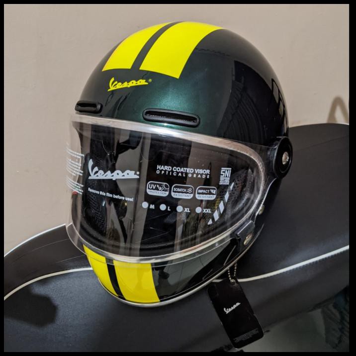 Tentu modelnya kental dengan nuansa sporty dan retro. This product fits on almost all products. Helmet PIAGGIO Vespa VJ Racing Sixties size M 57-58cm 950g ABS ratchet closure yellow green with visor Special Edtion ECE 2205.